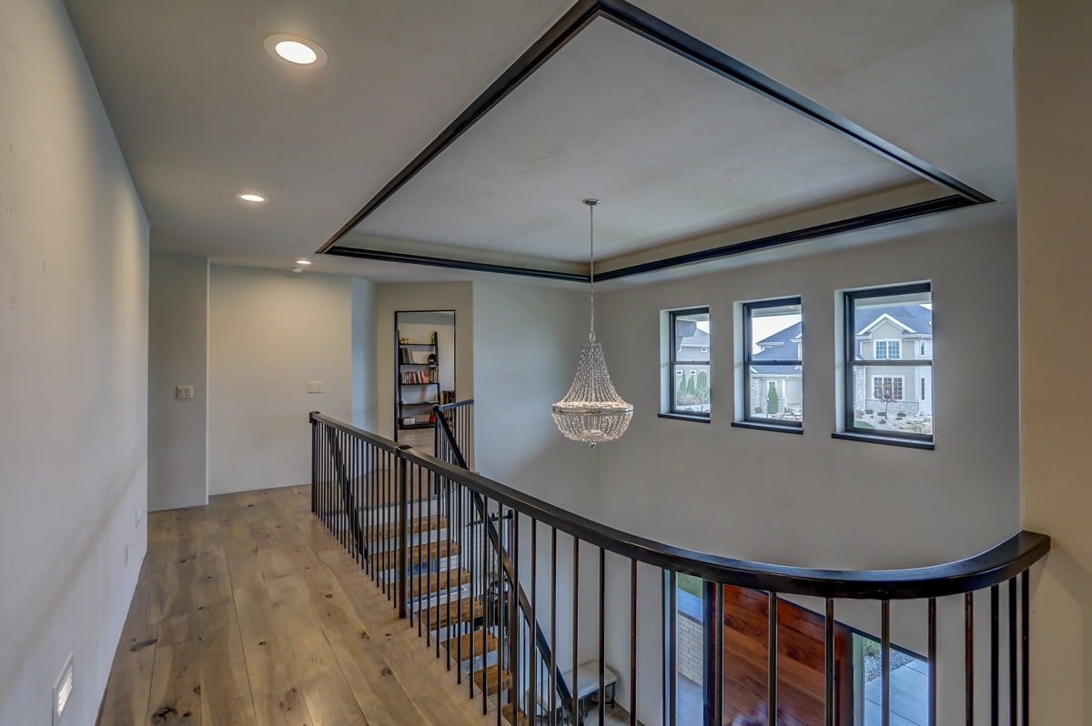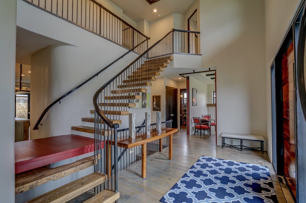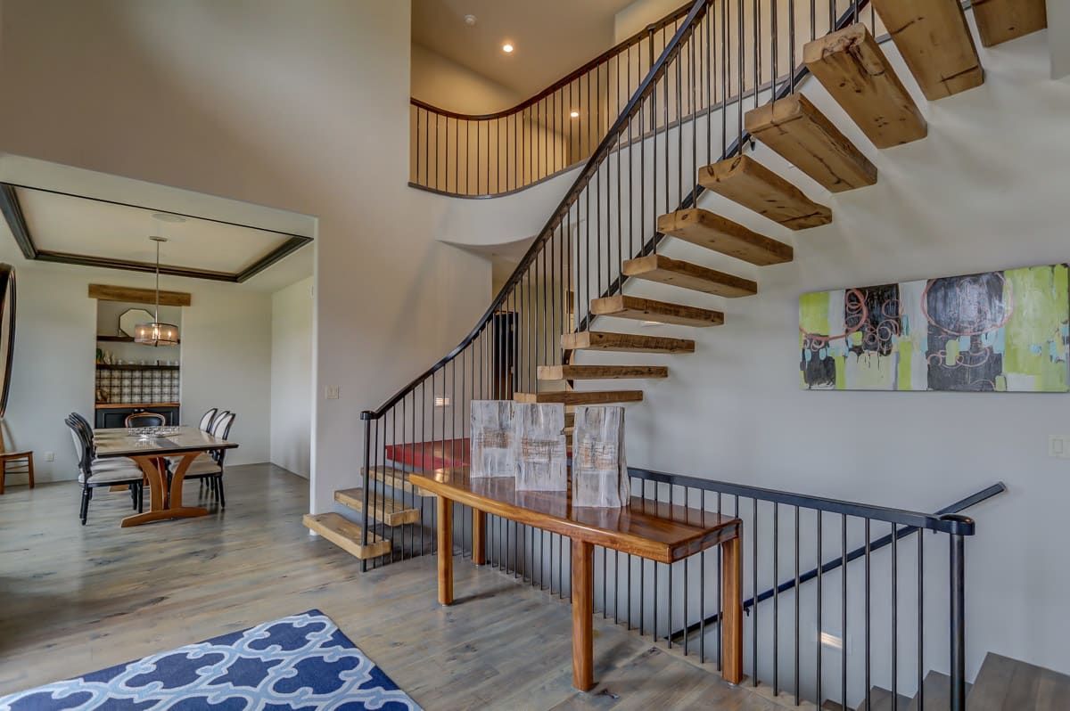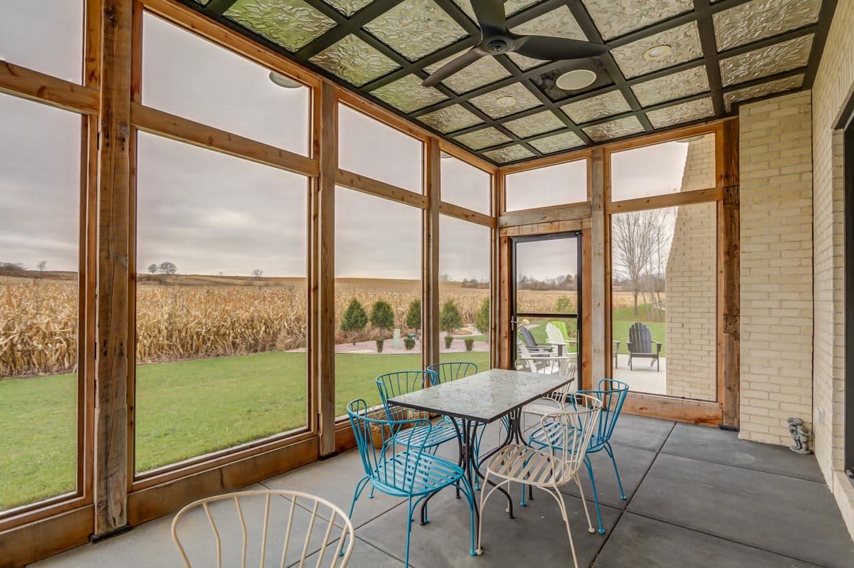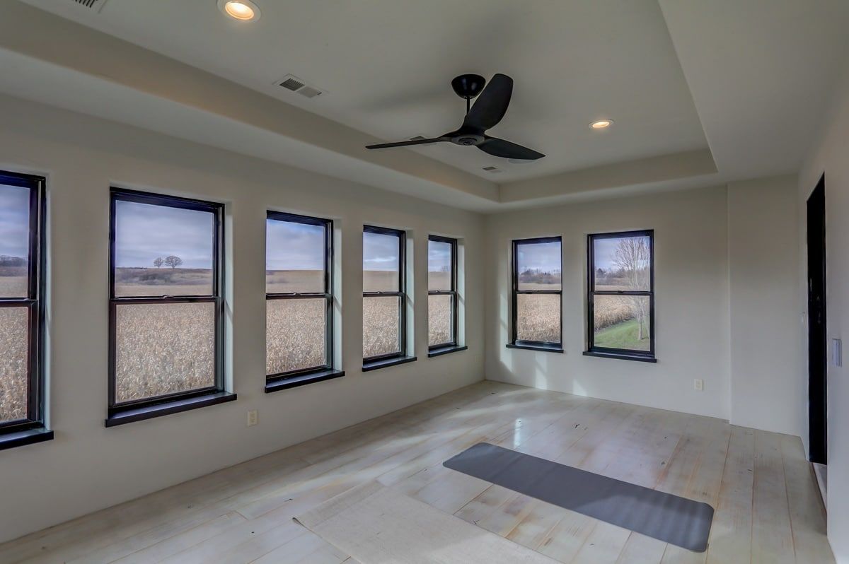 The custom-built, cantilevered staircase is made from the same southwest Wisconsin reclaimed barn wood as the den mantle. Upstairs you'll find 6 generous sized bedrooms and four full bathrooms including a luxurious master suite retreat with stand-alone spa bathtub, fully tiled shower, as well as a private yoga studio/meditation room overlooking the nearby fields.