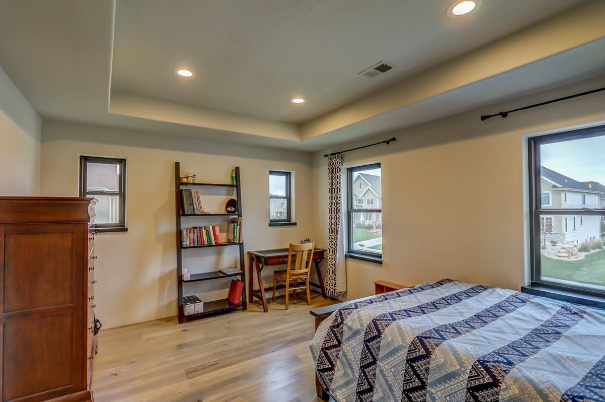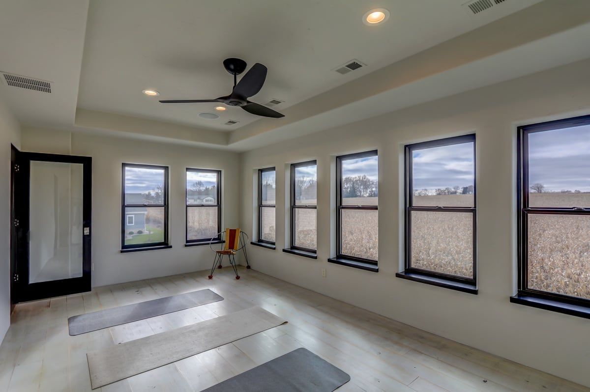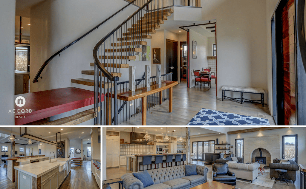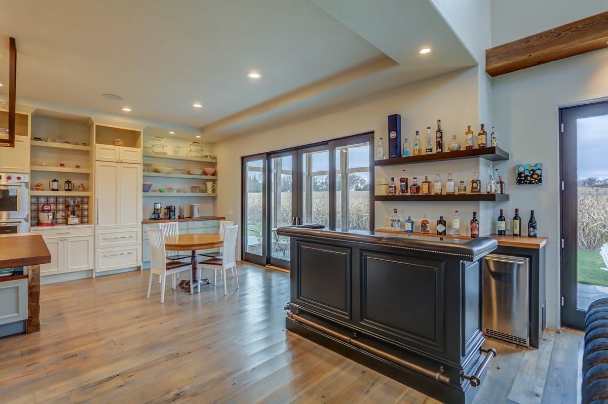 The custom-built, cantilevered staircase is made from the same southwest Wisconsin reclaimed barn wood as the den mantle. Upstairs you'll find 6 generous sized bedrooms and four full bathrooms including a luxurious master suite retreat with stand-alone spa bathtub, fully tiled shower, as well as a private yoga studio/meditation room overlooking the nearby fields.