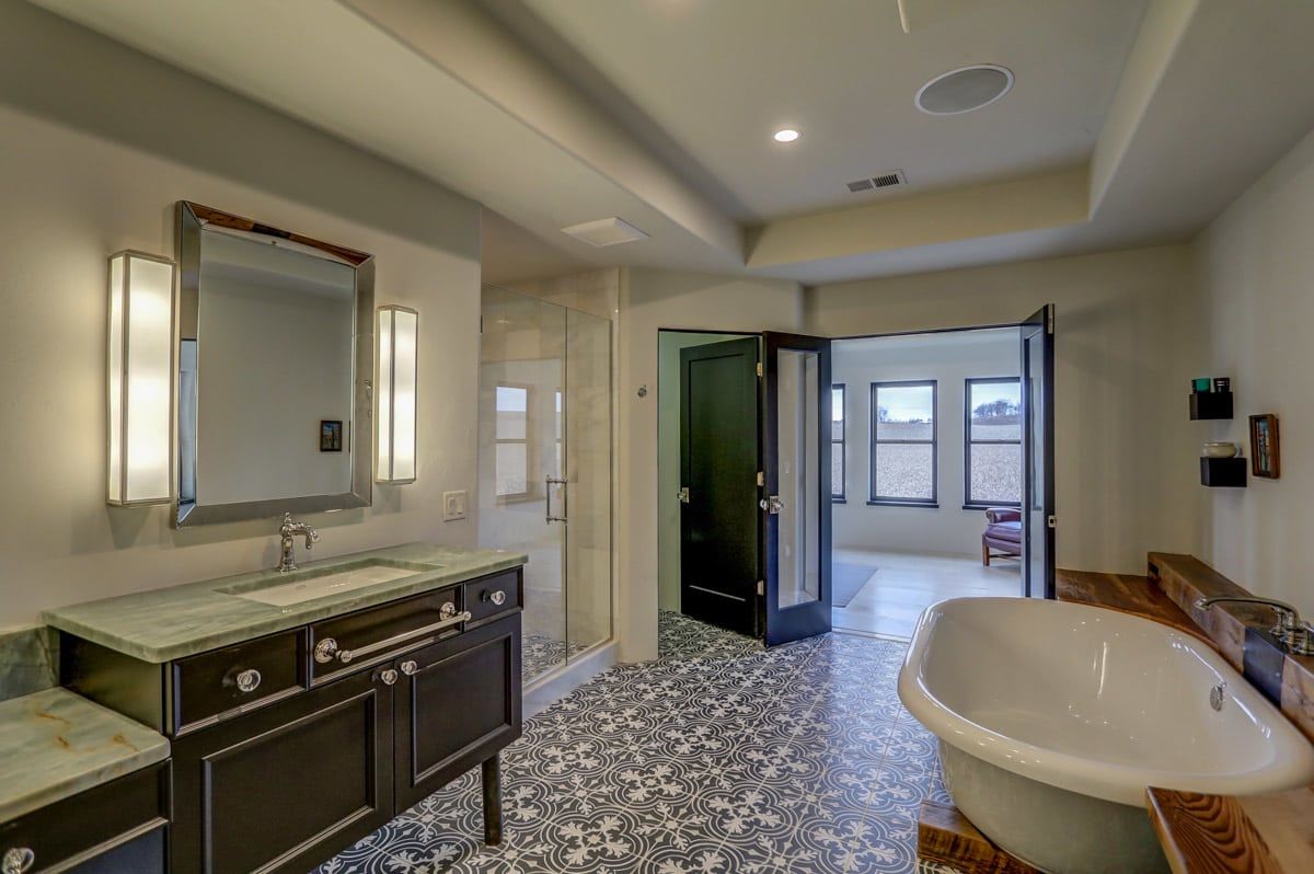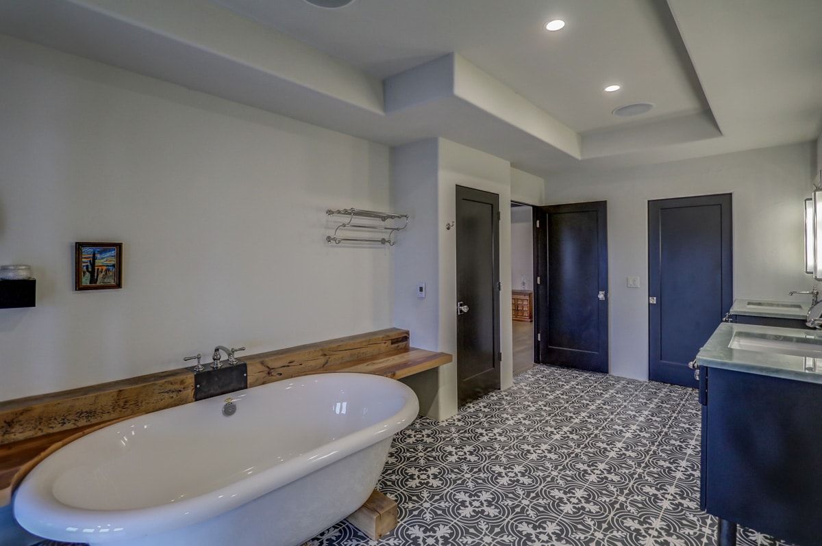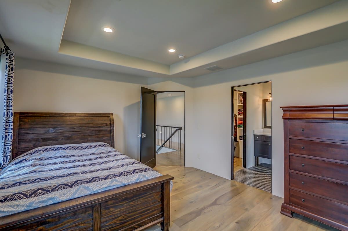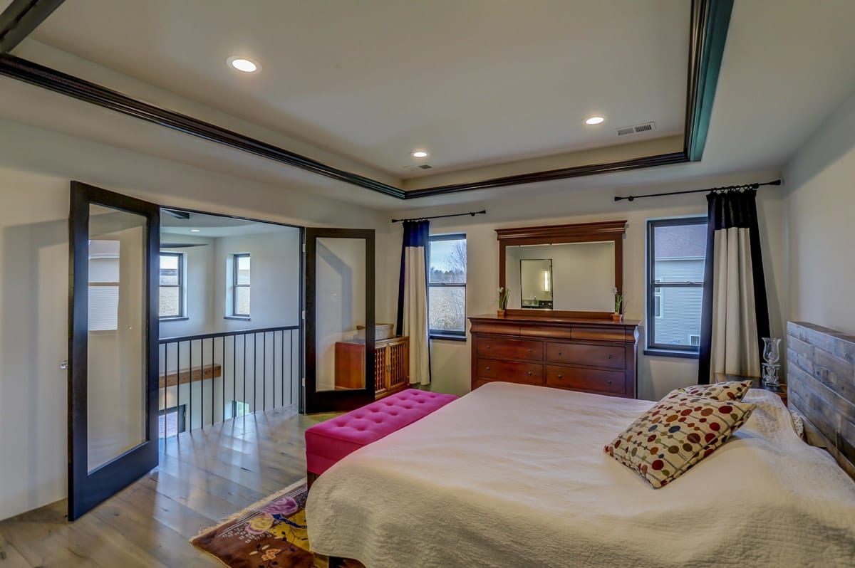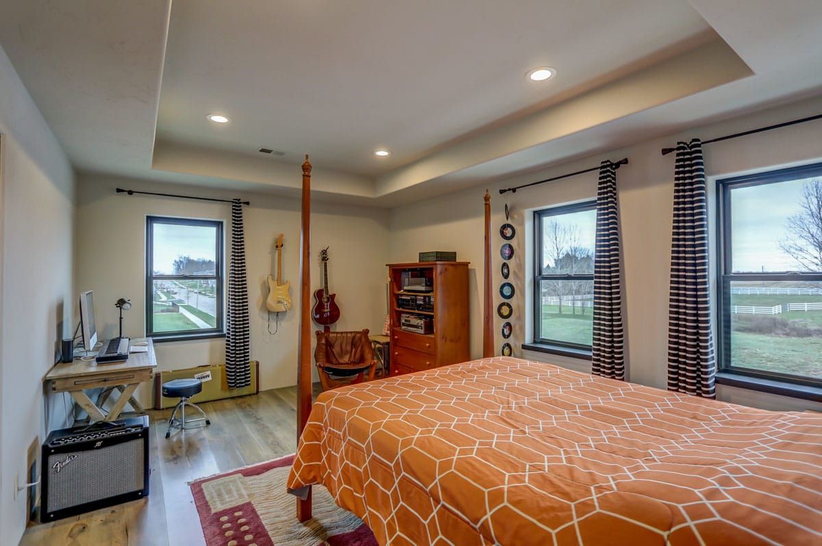 The custom-built, cantilevered staircase is made from the same southwest Wisconsin reclaimed barn wood as the den mantle. Upstairs you'll find 6 generous sized bedrooms and four full bathrooms including a luxurious master suite retreat with stand-alone spa bathtub, fully tiled shower, as well as a private yoga studio/meditation room overlooking the nearby fields.