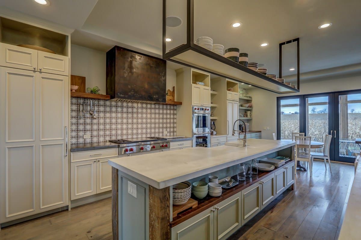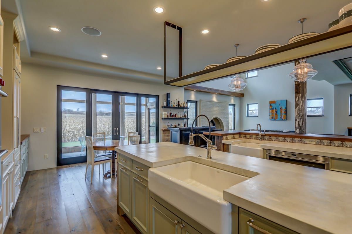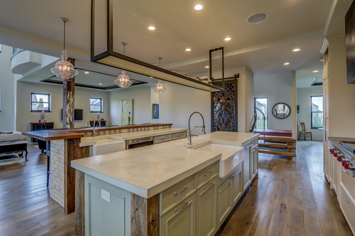 Perfect for chefs and families who love to entertain! This gourmet kitchen is complete with two Subzero refrigerators and two sinks (both are farmhouse style and one is extra large) plus double Wolf convection ovens, Wolf Four Burner Range with double griddle, and sleek, modern concrete countertops with Black Walnut accents. Two large islands make dinner prep a breeze PLUS a large, well-organized pantry with an antique stained glass door repurposed from a German church offer seamless storage solutions.
