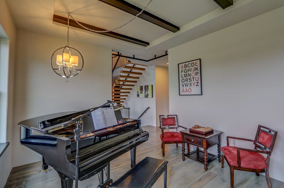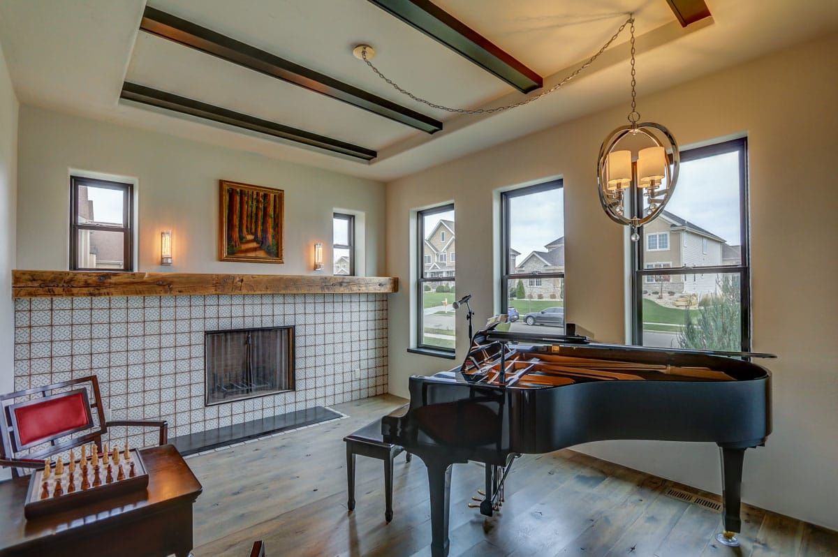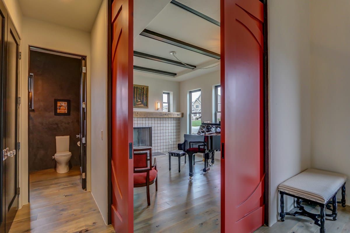 The first floor also includes a beautiful music/studio/den space, complete with large barn doors that can provide privacy when needed. You'll also find a custom tilework fireplace surround and a mantle made from locally reclaimed barn wood. This cozy room is ideal for music lovers, artists, writers, and more.