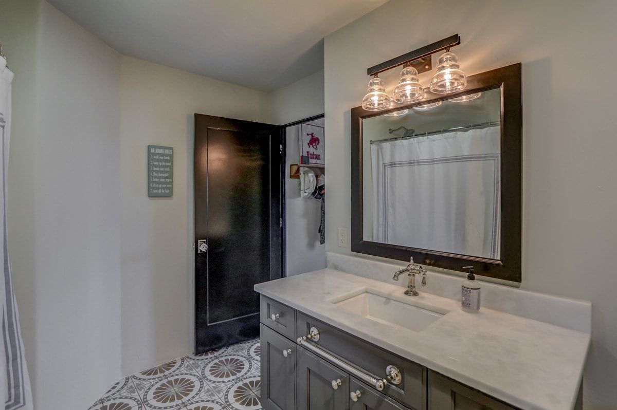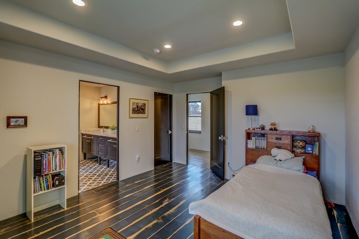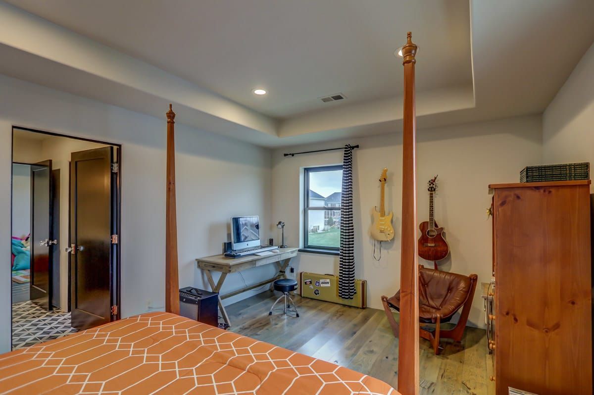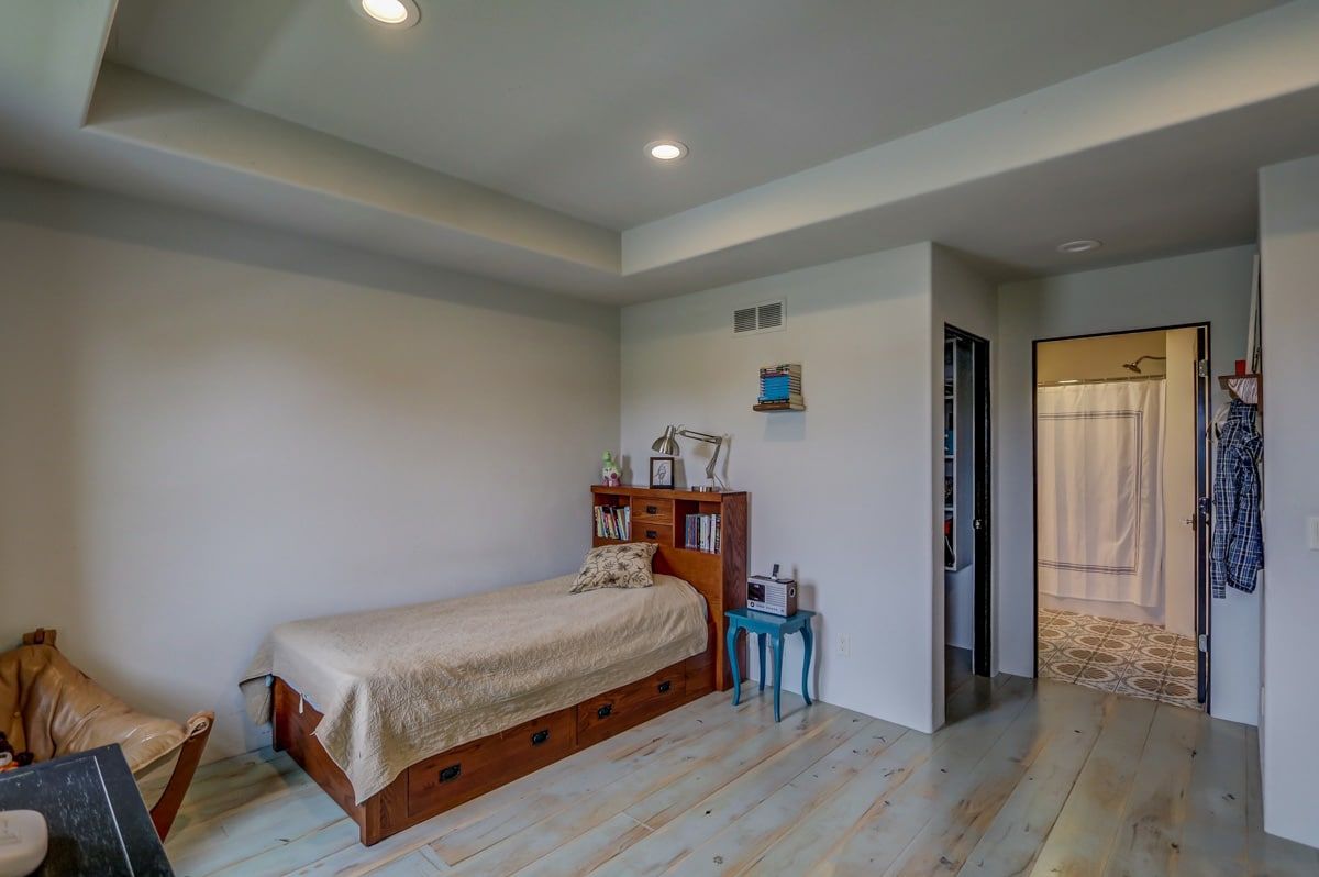 The first floor also includes a beautiful music/studio/den space, complete with large barn doors that can provide privacy when needed. You'll also find a custom tilework fireplace surround and a mantle made from locally reclaimed barn wood. This cozy room is ideal for music lovers, artists, writers, and more.