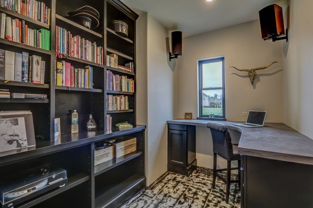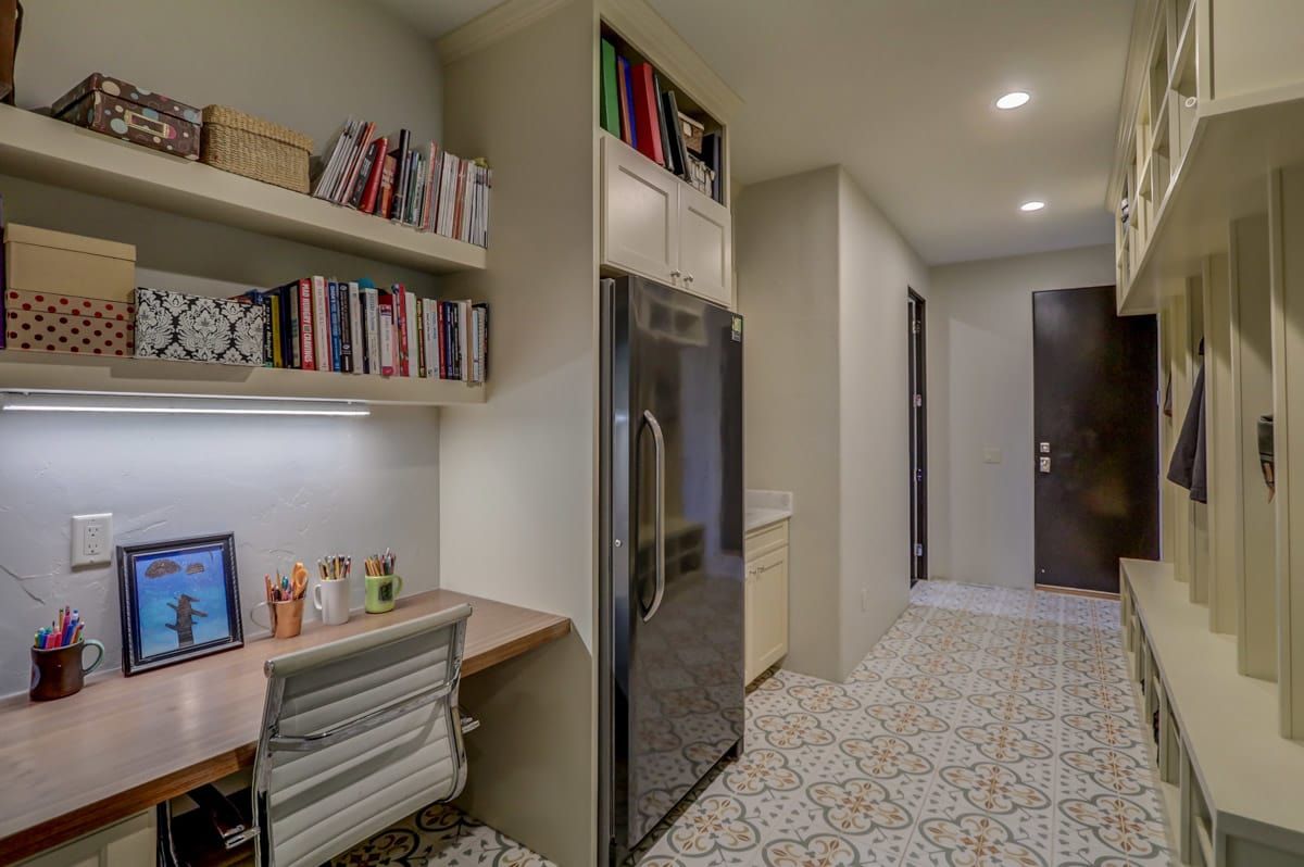 Conveniently located right off the kitchen, the large mudroom has six built-in cubbies as well as a private office space with bookshelves. Perfect for hiding your household clutter, coats, and boots away from your guests.